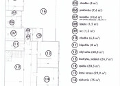 Centrálnu časť domu tvorí priestranná obývacia miestnosť (61 m2) s krbom s prieduchmi do piatich miestností a dreveným masívnym schodišťom. Na prízemí sa tiež nachádza kuchyňa s jedálňou, spálňa, kúpeľňa s vaňou a dvomi umývadlami, samostatné WC, špajza.